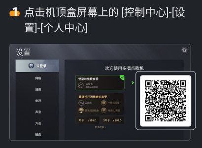 1、先点击电视屏幕上的【控制中心】-【设置】-【个人中心】进行登录,调出二维码。
