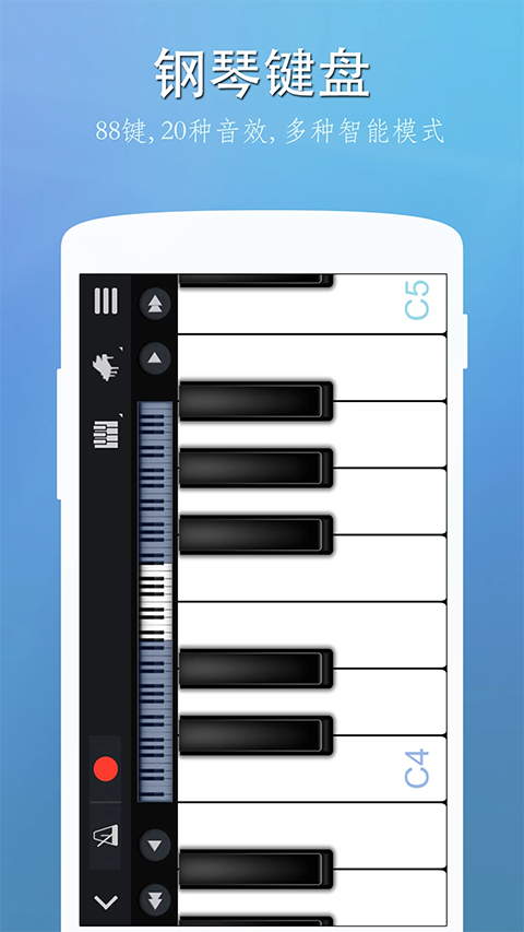 完美钢琴是一款免费的手机钢琴模拟应用,它内置了70首范例歌曲供玩家学习,就算是不懂五线谱的用户也能轻松玩转,该软件不仅支持感情全键盘、多点触控、力度侦测、按键宽度调节和等功能,同时还拥有录音功能,如果你愿意的话,还可将自己弹奏的乐曲设置为专属的手机铃声。
