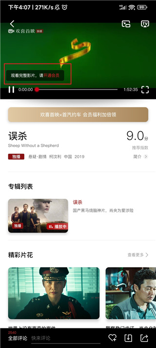 4、可以看到在播放界面有一行小字提示“观看完整影片,请开通会员”,说明软件内的影视作品并不是完全免费的;